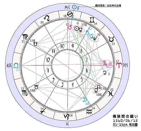 One-Point ◆ 信長は蟹宮の生まれ(太陽)です。蟹宮は上掲のホロスコープでは「現場」を象徴し、トランシットの「火星」もまた信長の出生時の「太陽」に合=0度の時間帯でした。そこに天王星と冥王星が大三角=120度×3をとっていることから大逆転が象わされています。