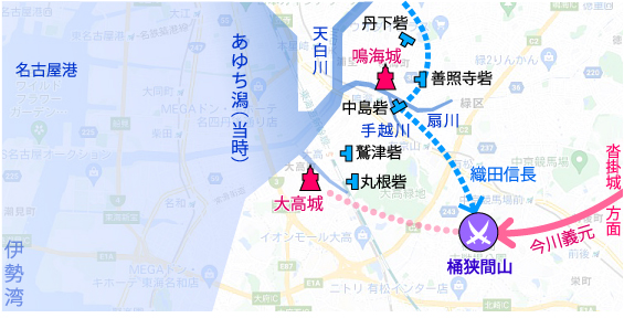 夜明け時、名古屋の北西の清州城で「丸根砦と鷲津砦が囲まれた」との一報に接した信長は、わずか5名で城門を出て、南東の熱田まで十数キロを一気に駆け抜けます。